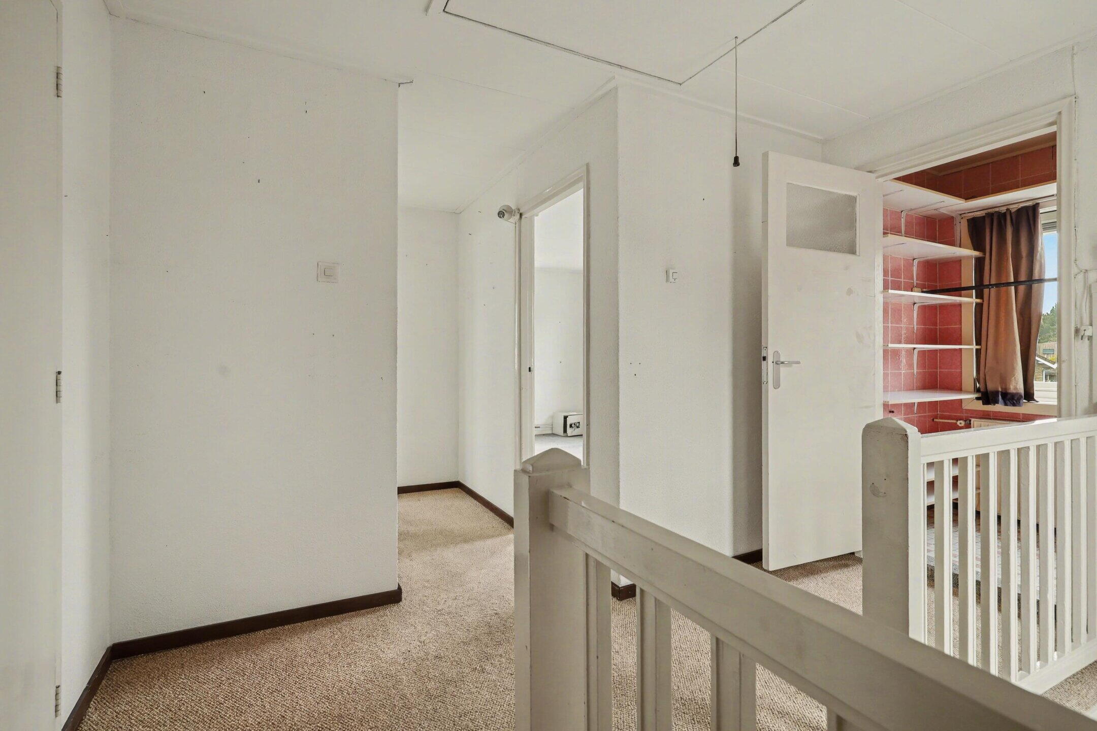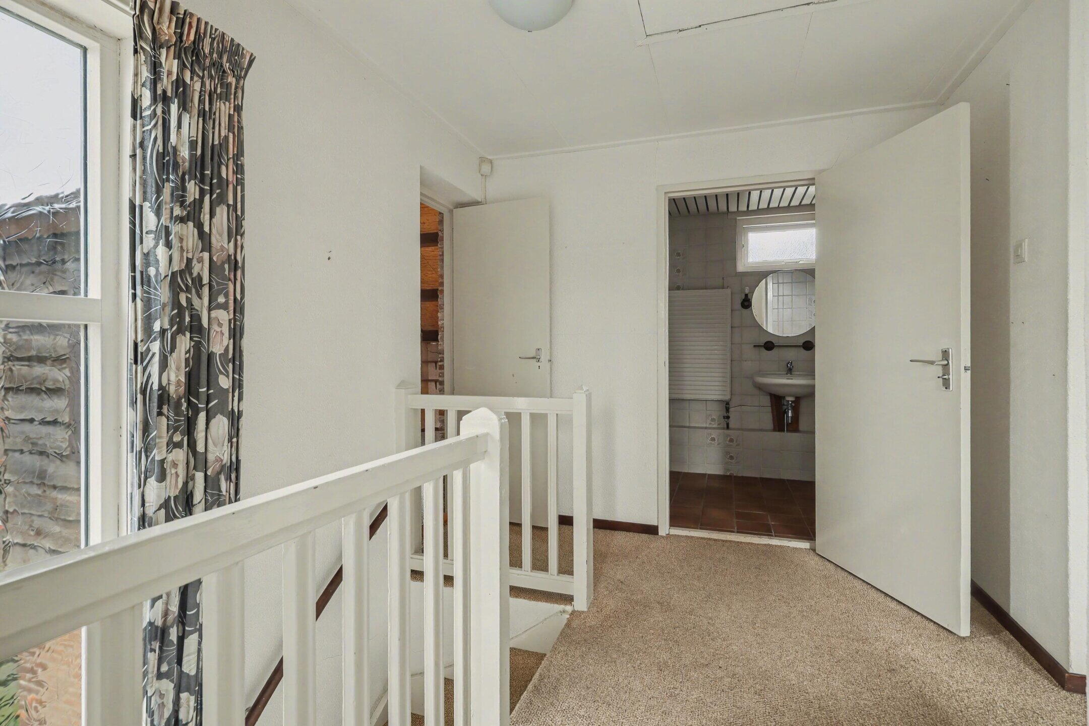 Ruime overloop met toegang naar 4 slaapkamers en de badkamer. De kleinste slaapkamer, vroeger de badkamer, kan prima dienst gaan doen als kledingkamer. Eén van de slaapkamers is zeer ruim en ook voorzien van een sfeervolle potkachel. De badkamer is voorzien van 2e toilet, douchecabine, ligbad en wastafel.